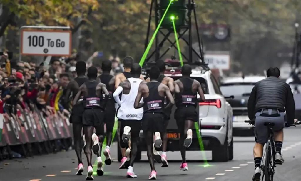 但那次纯属技术试验,不是正式比赛—— 41 个配速员轮换排成 V 型破风编队,前面还有激光配速车打绿光引导。