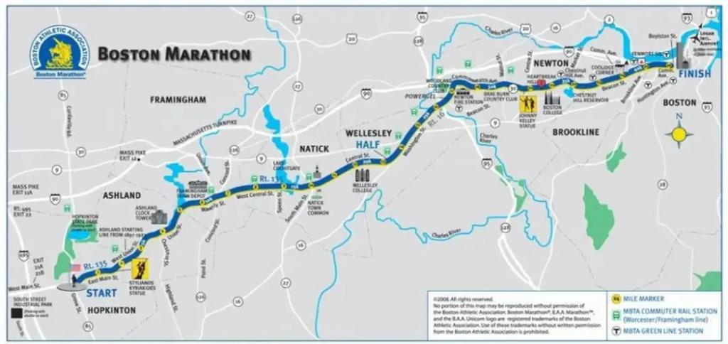 波士顿是大满贯里地形最诡异的。起点海拔约 145 米,终点仅约 5 米,净下降 140 米,超过世界田联认证范围。