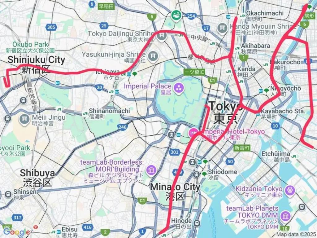 东京总爬升 60 米,开局有个下坡,后程基本平坦。-38 米的净下降,恰好卡在世界田联的认证范围内(起点到终点的净落差不能超过每公里 1 米,全程不能超过 42 米)。