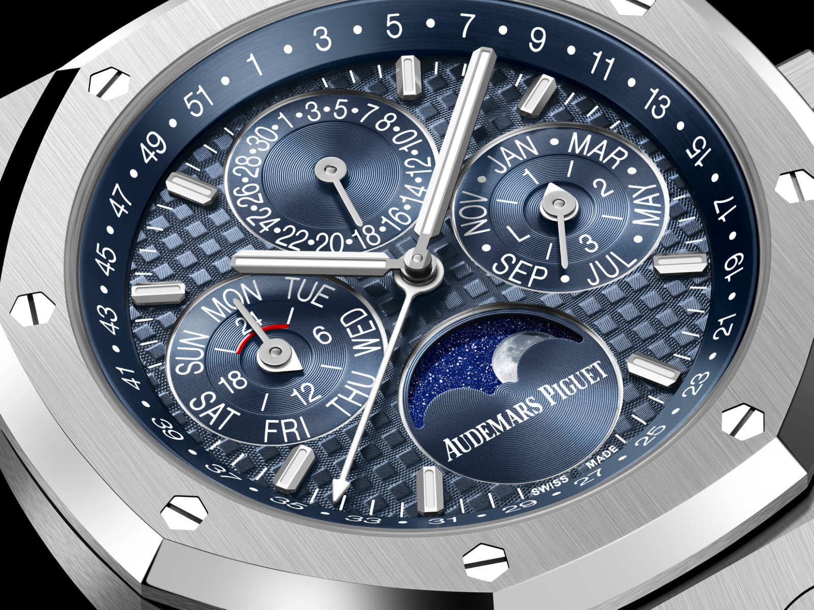 得益于爱彼这一全新的表冠调校机制,所有日历功能均已同步,并且由于机芯构造更为坚固,即便佩戴者尝试在日期自动跳转机制启动时段(晚上9点至凌晨3点)调校时间,也不必担心日历功能不同步,或损坏机芯。
