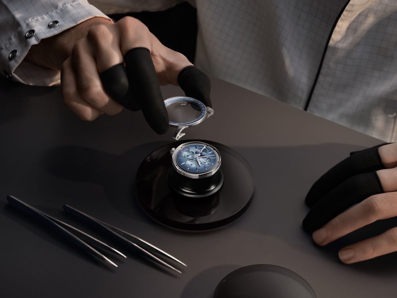 这枚全新CODE 11.59系列腕表采用了该系列标志性的浮雕图案,由从表盘中心向外层层潋滟开来的同心圆构成,并缀以数以百计的微小凹槽,营造出丰富的光影与视觉层次美感。带有这个浮雕图案的烟熏蓝色调表是由物理气相沉积工艺制成,是爱彼设计团队携手瑞士机刻雕花大师Yann von Kaenel研制而成,采用大师手工精心雕刻压印模板,于2023年被爱彼首次引入CODE 11.59系列。