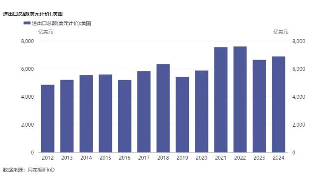 2024 年,中国与美国的进出口总额达到 6882.8 亿美元 数据来源:同花顺 iFinD
