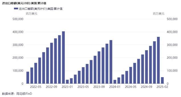 2024 年,中国与美国的进出口差额约 3610 亿美元 数据来源:同花顺 iFinD
