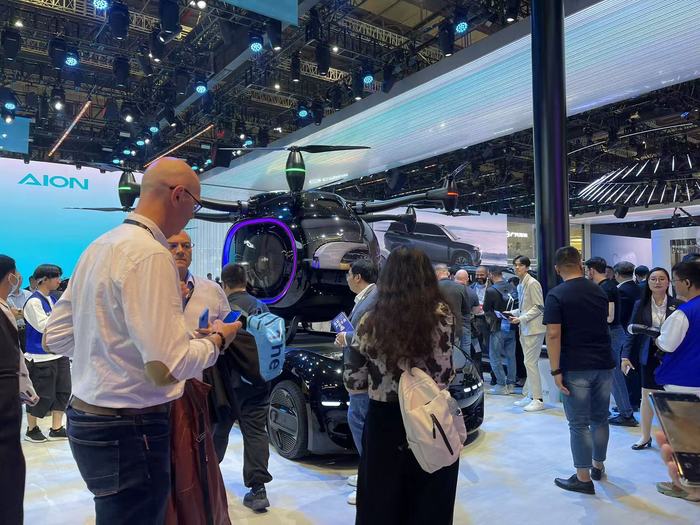 除了小鹏汽车,放眼各个展厅,多数馆内都会有几家展商选择用独立的科技产品作为吸引观众的策略。例如,长安汽车在车展上带来了人形机器人和飞行汽车等,广汽也将飞行汽车产品展示在最显眼的位置。