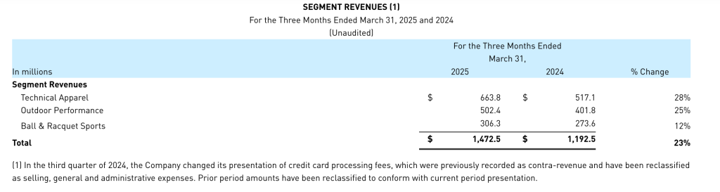分业务板块来看,户外功能性服饰一季度营收同比增长28%至6.64亿美元,在固定汇率基准下同比增长32%;山地户外服饰及装备一季度营收同比增长25%至5.02亿美元,在固定汇率基准下同比增长29%;球类与球拍装备同比增长12%至3.06亿美元,在固定汇率基准下同比增长13%。