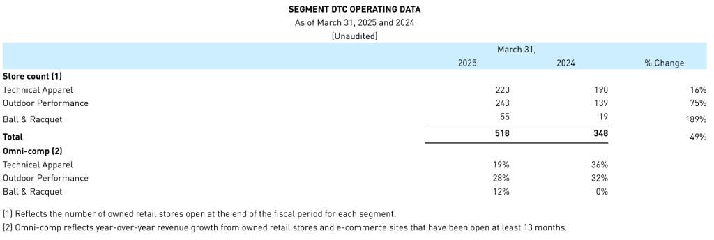 管理层在财报后的电话会上介绍,第一季度始祖鸟净新增门店零家,新开4家关闭4家。今年,始祖鸟计划在全球范围内净新增约25家门店,整体开店规模与2024年相当,同时将继续关闭部分奥特莱斯门店及低效点位。