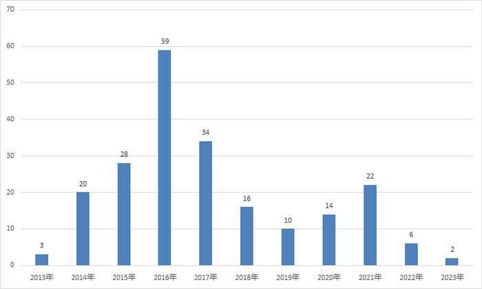 Wind数据显示,2014年-2021年上海富善投资每年成立的新产品数量均不少于10只,但是2022年和2023年公司分别仅成立6只和2只新产品,此后至今再也没有成立新产品。