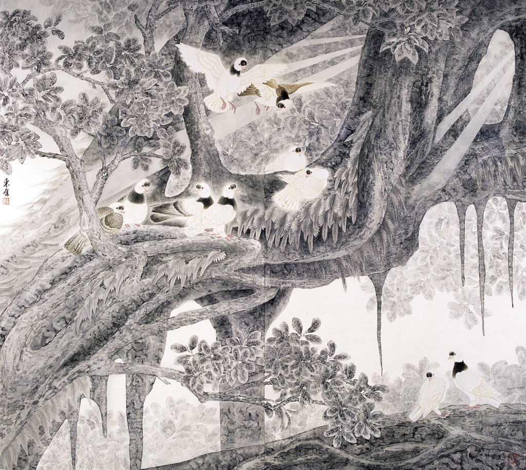 “我父亲的画特别有生命力,很少有程式化的东西,”吴东奋之子吴帆向记者回忆,“有一次我父亲无意中把水洒在了画上,发现比起线条细腻的传统工笔技艺,这样一来反而出现了很独特的斑驳效果,十分有意境,由此开始了对水墨工笔画的探索。”这样的探索也使得原本多用于小画幅的工笔画,也能表现出宏大的画面。