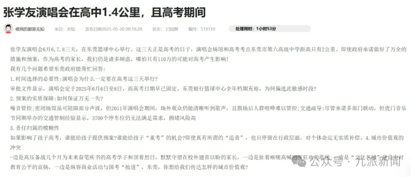 在东莞市阳光问政平台上,已有不少网友提出意见,希望官方将演唱会延期举办。从网友发布的帖子来看,大部分家长的担忧在于,演唱会产生的噪声和人群喧哗是否会影响到考生的复习和休息,演唱会举办期间是否会造成交通拥堵,以及周边的酒店、餐饮等是否将因此而涨价。