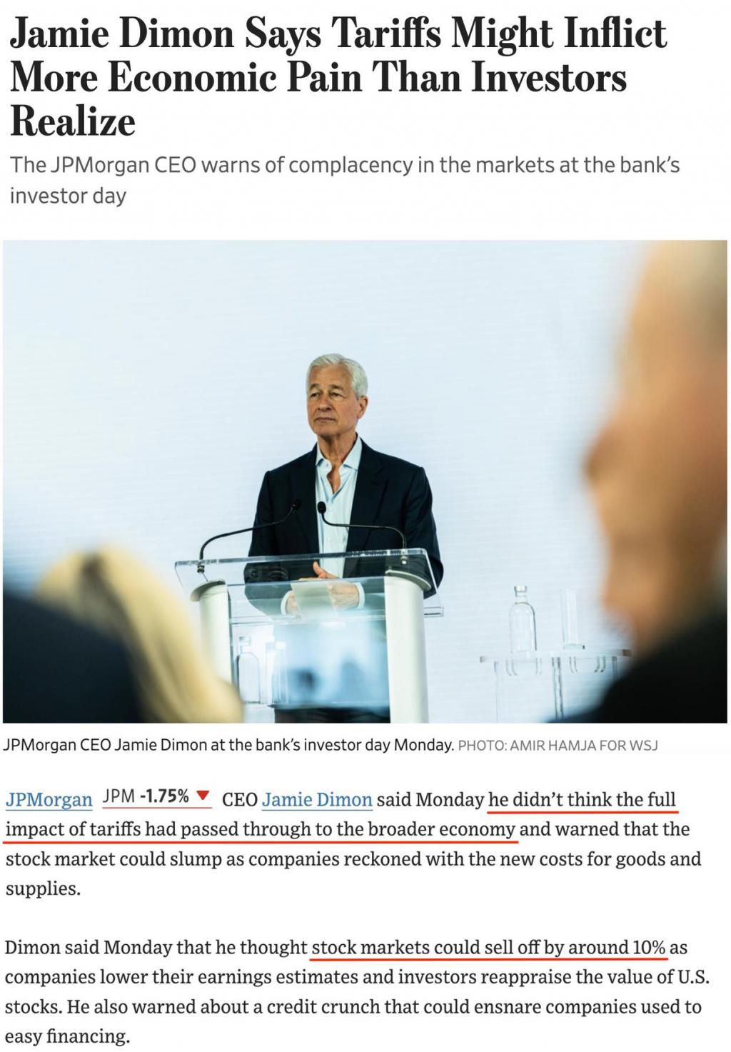 摩根大通公司首席执行官杰米 · 戴蒙近日指出,关税的全部影响尚未传导至整体经济,通胀加剧和滞胀的可能性比人们认为的要大,随着企业下调利润预期以及投资者重新评估美国股票的价值,股市可能下跌约 10%。