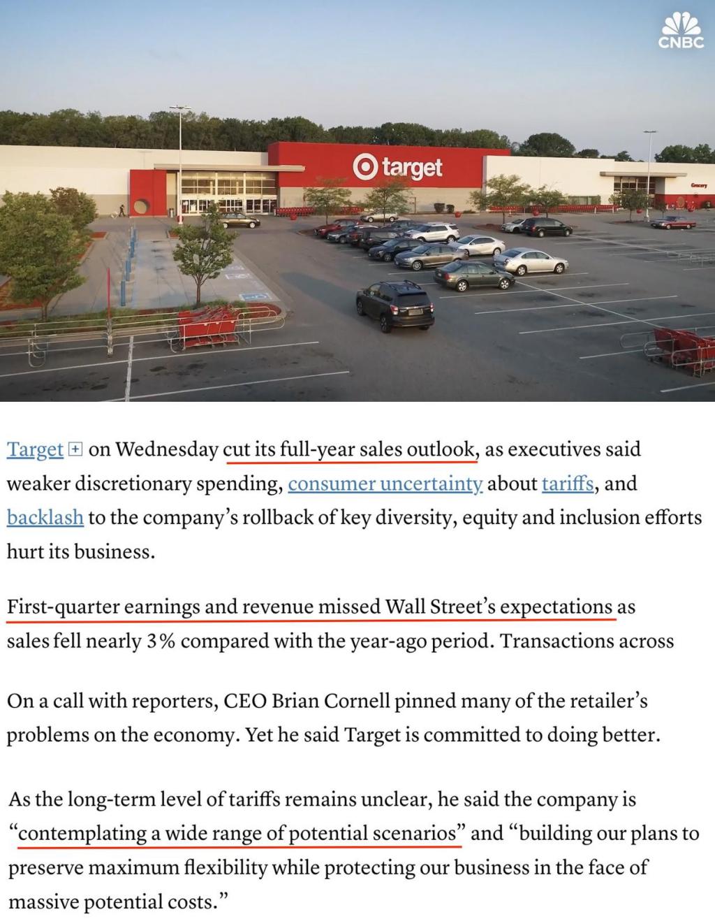 美国知名零售商塔吉特百货公司第一季度的收益和收入均低于预期。由于业务受到关税的不确定性等因素损害,该公司 21 日下调了全年销售预期。