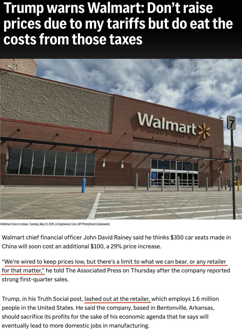 美国最大零售业企业沃尔玛的涨价预告甚至惹恼了总统特朗普。特朗普在社交媒体上发文抨击沃尔玛将全面涨价归咎于关税,称该公司应该承担美国关税政策所带来的额外成本,而不是向顾客收费。
