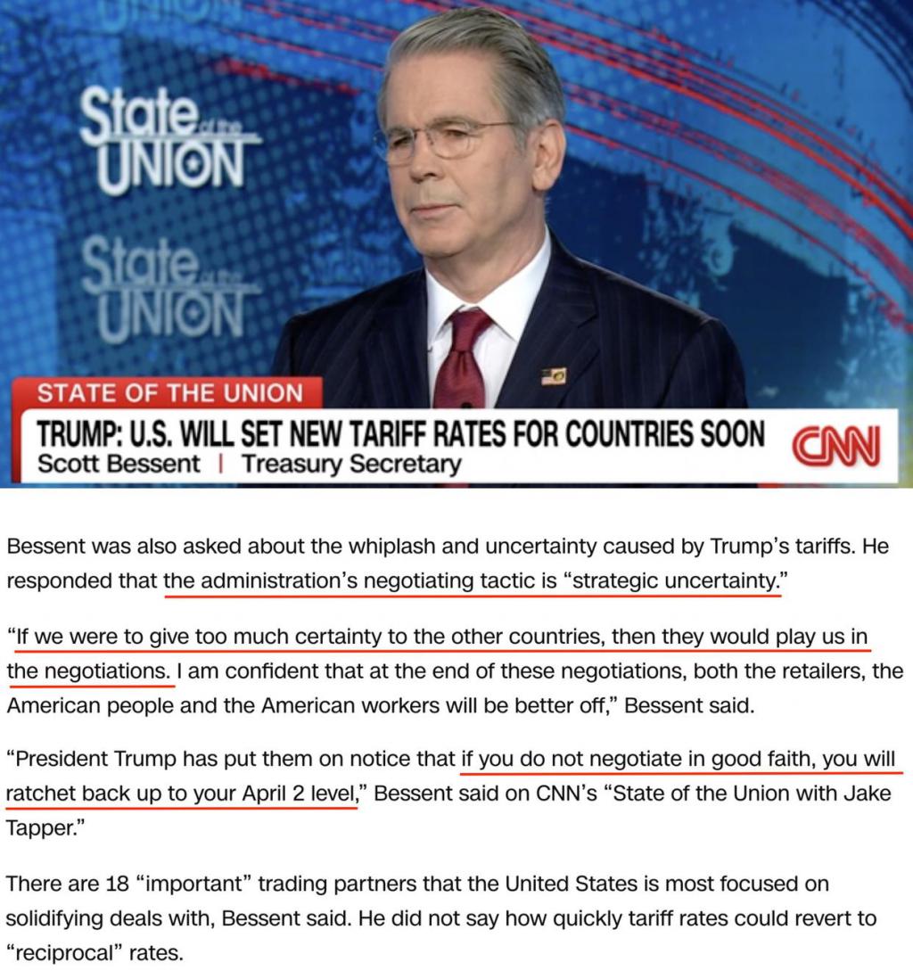 贝森特表示,美国政府正专注于与 18 个最重要的贸易伙伴,如果对方没有 " 诚意 ",他们的关税税率将回到 4 月 2 日的 " 对等 " 水平。