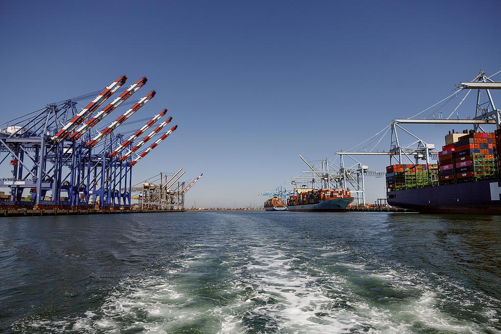 △当地时间 2025 年 5 月 9 日,美国加州洛杉矶港,左侧通常繁忙的码头现在却集装箱稀少。(图自视觉中国)