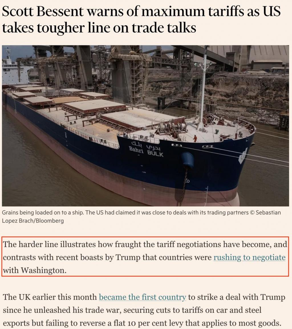 英国《金融时报》称,这表明关税谈判已经变得十分令人担忧,与美国总统最近吹嘘各国正急于与美国谈判形成了鲜明对比。