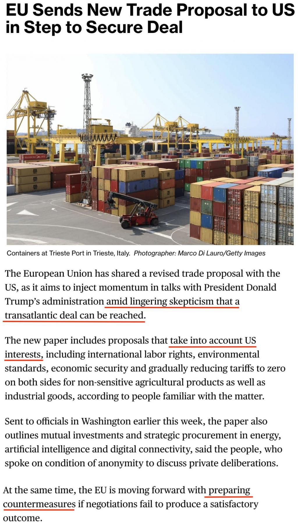 但目前外界对能否达成跨大西洋协议仍持怀疑态度。为此,欧盟同时也在推进反制措施的准备工作,以防谈判未能取得令人满意的结果。