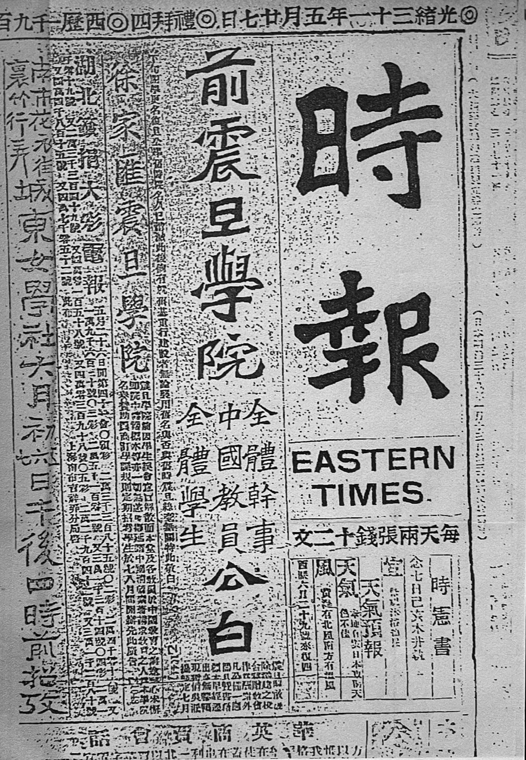 1905年6月29日,原震旦学院教师于《时报》登载《前震旦学院全体干事中国教员全体学生公白》。翻拍自马相伯故居
