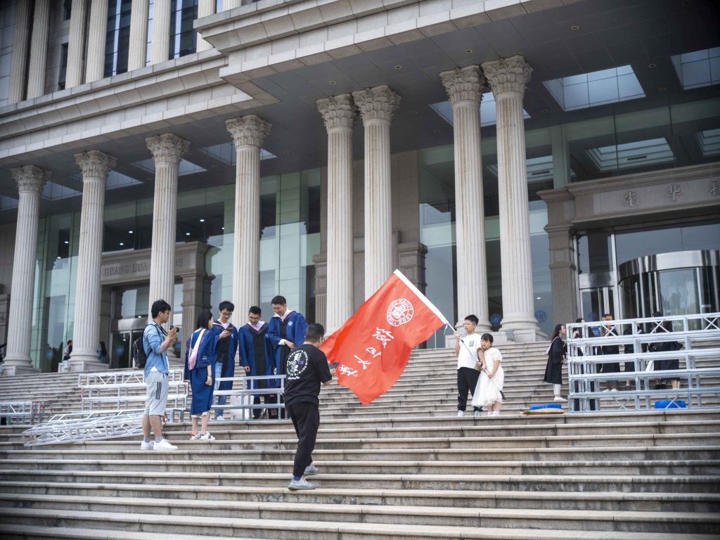 2025年5月18日,复旦大学建校120周年纪念日前夕,学生们和亲友在光华楼的台阶上留影。澎湃新闻记者 许海峰 图