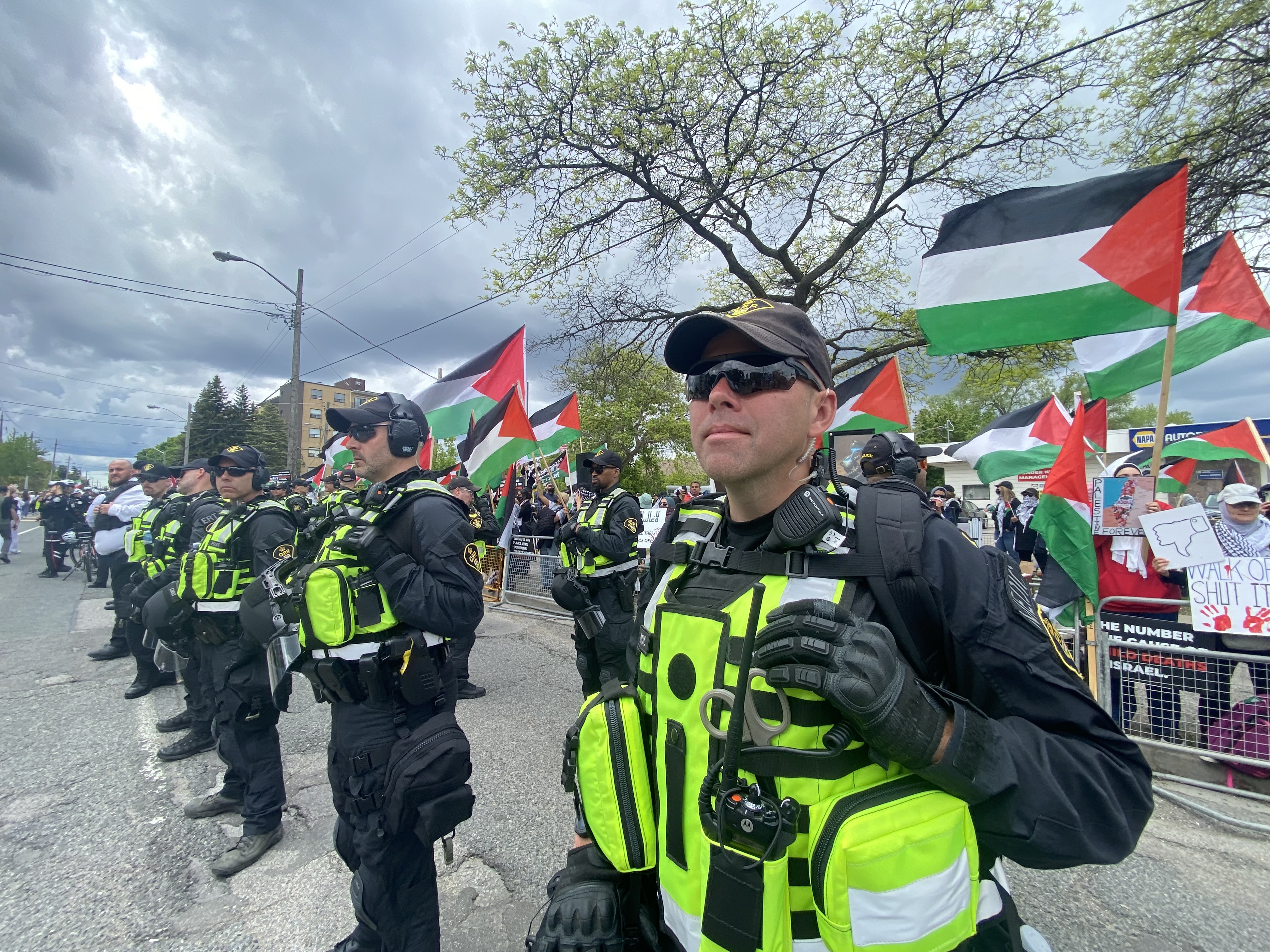 2025年5月25日,在多伦多举行的年度“与以色列同行”活动上,在路障后面的亲巴勒斯坦抗议者面前,可以看到警察的警戒线。Max Trotta/环球新闻