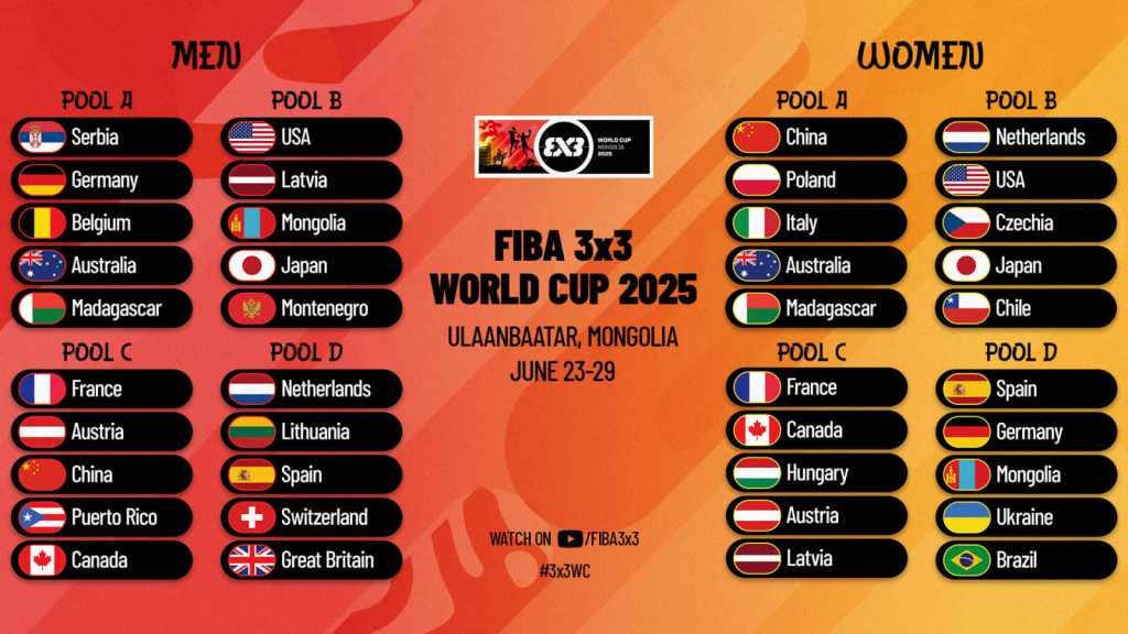 2025年国际篮联3x3篮球世界杯是一项国际性的3x3篮球赛事,将于6月23日-6月29日在蒙古国首都乌兰巴托进行。本届赛事共有男女各20支队伍参赛。其中前四天为小组赛,采取组内单循环,积分排名前三的队伍晋级淘汰赛。6月27日,将在小组赛第二、三名的队伍中进行交叉淘汰赛,而各小组第一的队伍将直接晋级28日进行的1/4决赛。6月29日的半决赛、决赛,将产生本届世界杯的冠、亚、季军。