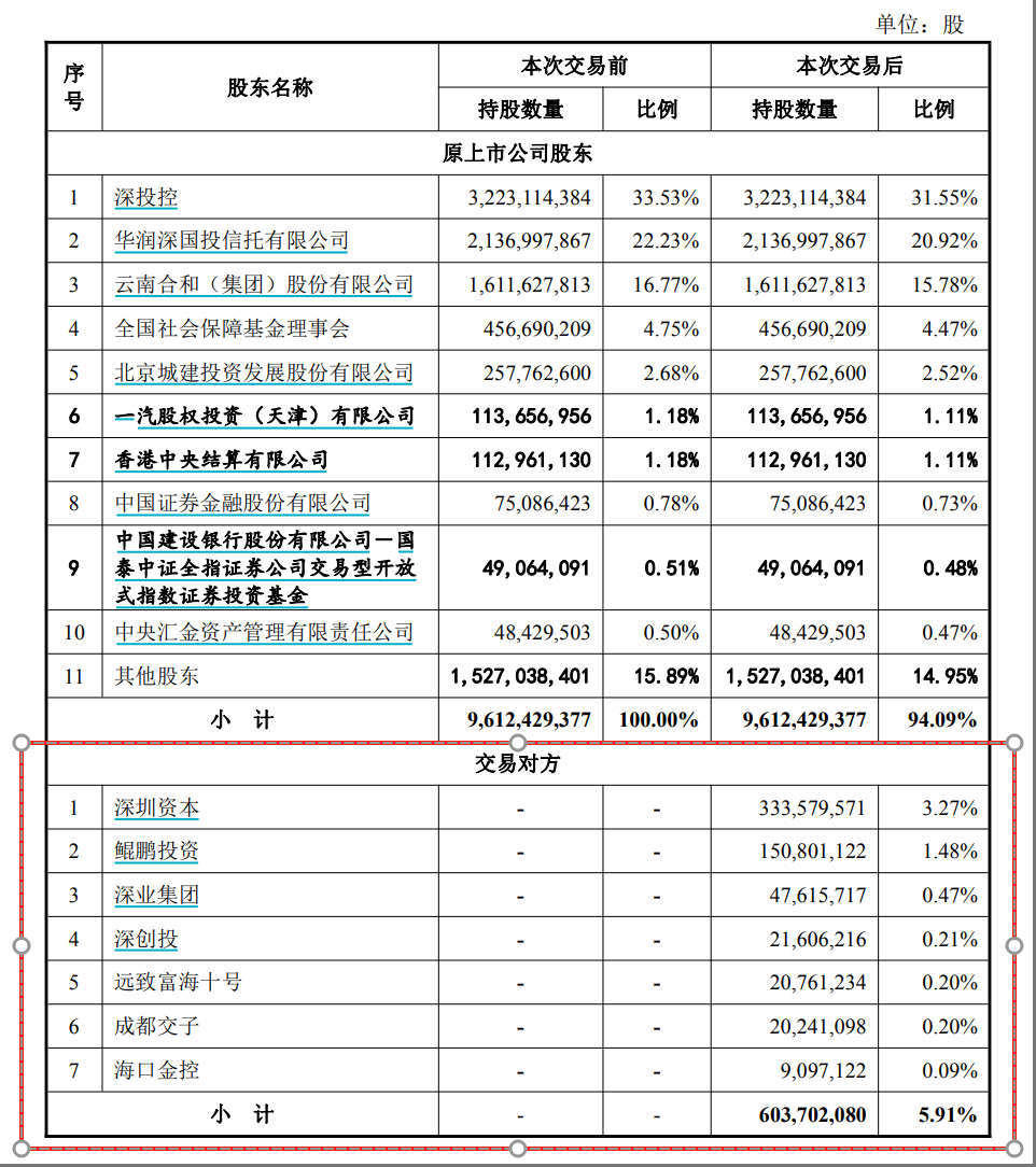 交易完成后,国信证券总股本将增加至102.16亿股,7名交易对手合计持有国信证券股份数将达到5.91%,超过国信证券现第四大股东——全国社保基金,国信证券前十大股东当中的后五位名单也将发生一定变化。