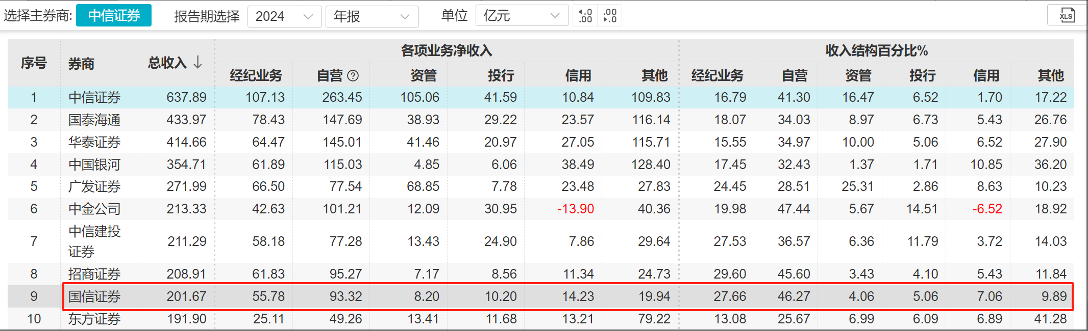 另就业务结构来看,国信证券2024年经纪、自营、资管、投行、信用五大业务净收入分别为55.78亿元、93.32亿元、8.20亿元、10.20亿元和14.23亿元,在wind券商排名中分列第八、七、九、七、九位。