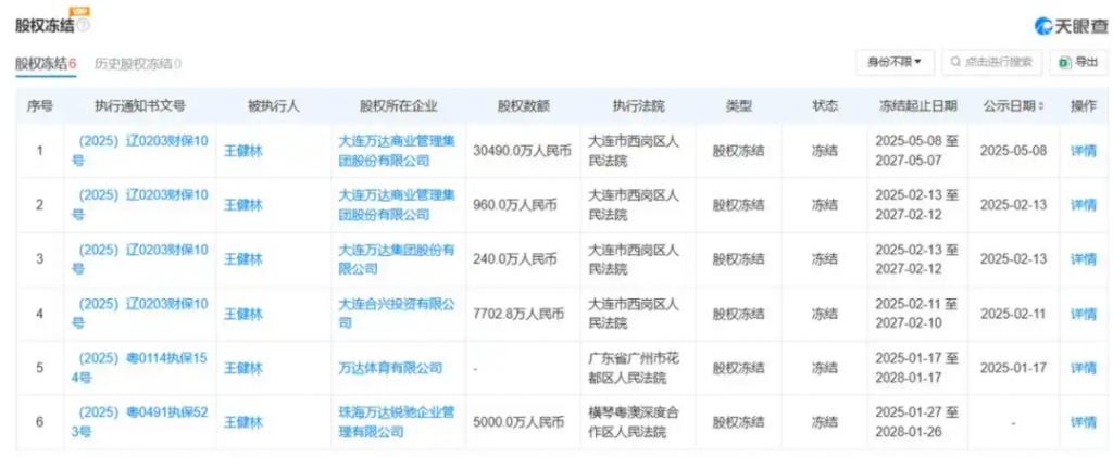 天眼查 App 显示,近日王健林所持大连万达商业管理集团股份有限公司超 3 亿元股权被冻结,执行法院为大连市西岗区人民法院。