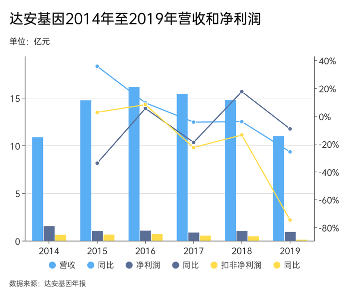 在新冠疫情前,达安基因的营收长期徘徊在十亿元上下,净利润和扣非净利润波动较大,常年维持在几千万元水平。其中,达安基因2014年营收首次突破十亿,在2015至2016年经历一轮短暂增长,但到了2017年至2019年又呈现明显回落态势。