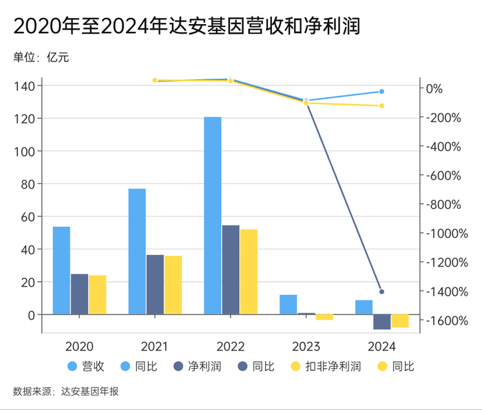 疫情后,达安基因的业绩被打回原形。特别还因为应收账款难收回和存货跌价,让达安基因出现亏损。2023年至2024年,达安基因分别实现营收11.81亿和8.53亿,扣净利润0.72亿元和-9.39亿元。