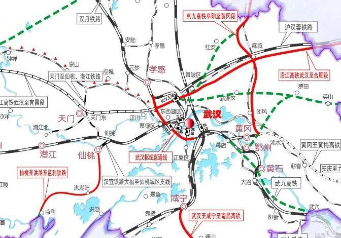 2020 年,湖北省政府工作报告提出,要加快争取武汉枢纽直通线项目。2022 年 3 月,《武汉市人民政府关于加快推进高铁项目建设的意见》也提到,全力推动沿江高铁、武汉铁路枢纽直通线等重大项目建设,打造以武汉为中心的 " 超米字型 " 高速铁路网。