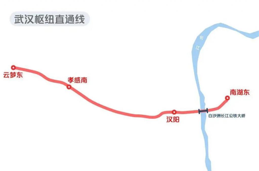 根据招标计划,武汉枢纽直通线自汉十高铁云梦东站引出,设孝感南站、汉阳站,沿武汉市三环线跨越长江,设白沙洲公铁两用长江大桥,过江后设联络线沟通武黄城际。新建正线 72.193 公里,联络线 8.605 公里,地方批复同步实施三四线线下工程 7.582 公里。项目工期 5 年。