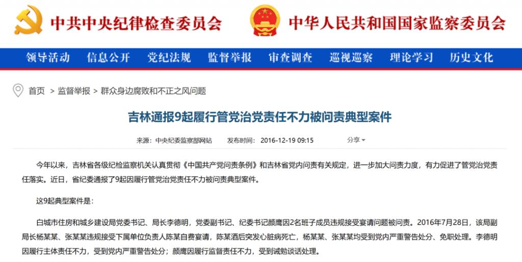 2016 年,吉林省纪委通报了 9 起因履行管党治党责任不力被问责典型案件,其中," 白城市住房和城乡建设局党委书记、局长李德明 " 的名字赫然在列。