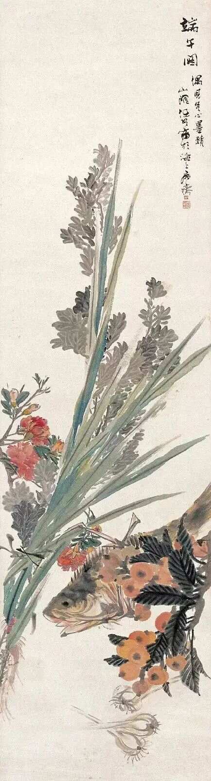 任伯年《端午图》用没骨画法描绘了艾草、菖蒲、蜀葵、枇杷、大蒜、鳜鱼等端午元素。