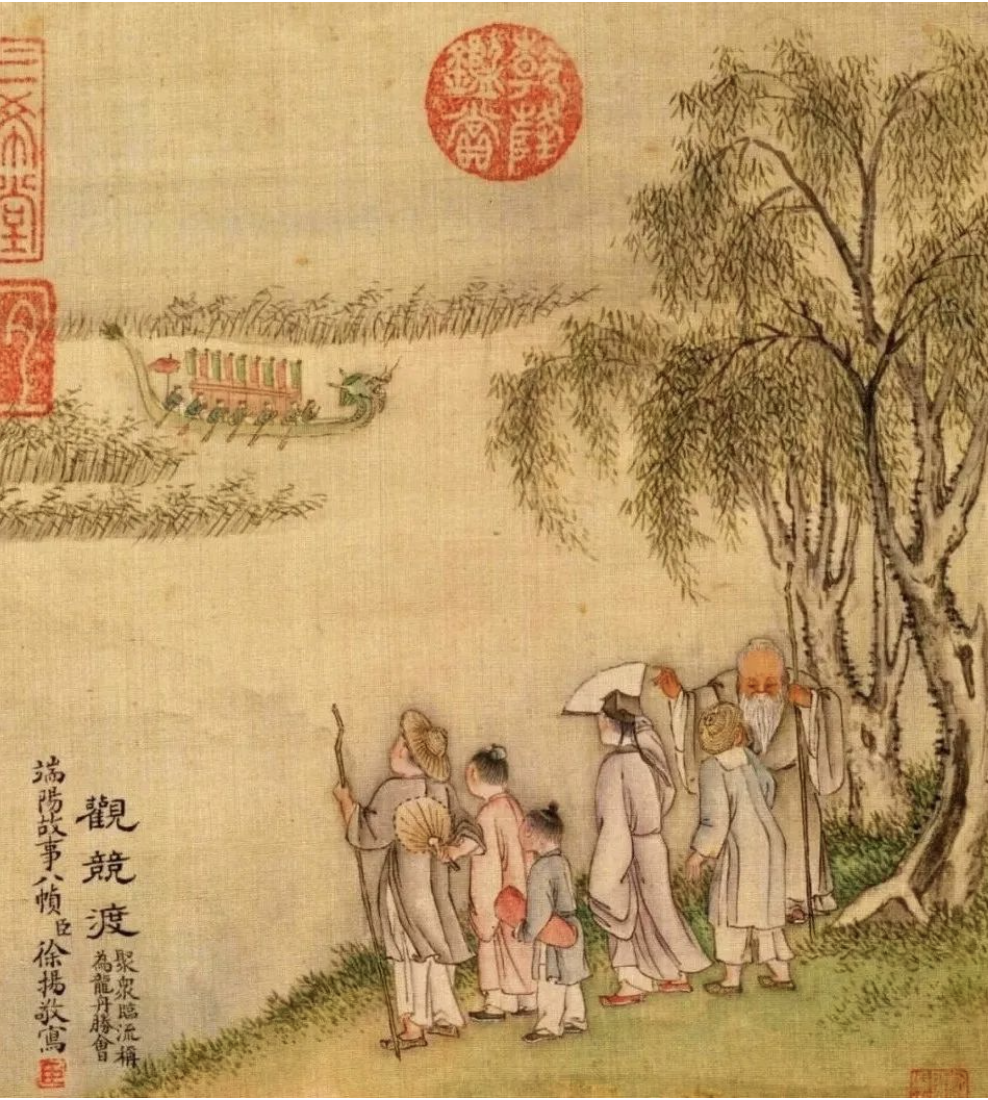 五月初五的端午龙舟竞渡。《十二月月令图 五月》清 佚名