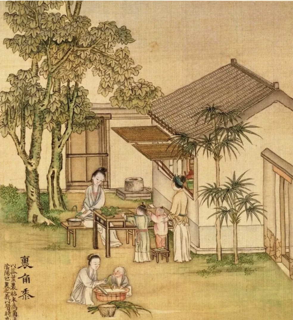清代《端阳故事图册》用八幅画打造习俗流程图,堪称古代版“节日指南”。记录射粉团、悬艾人、裹角黍、观竞渡等习俗。“射粉团”游戏据说是唐代端午节从宫廷内流出的:剥开几个用艾草汁浸泡过的黄米角黍,切成小块放在漆盘中,让客人们用特制的小弓箭射粉团,射中者得食。
