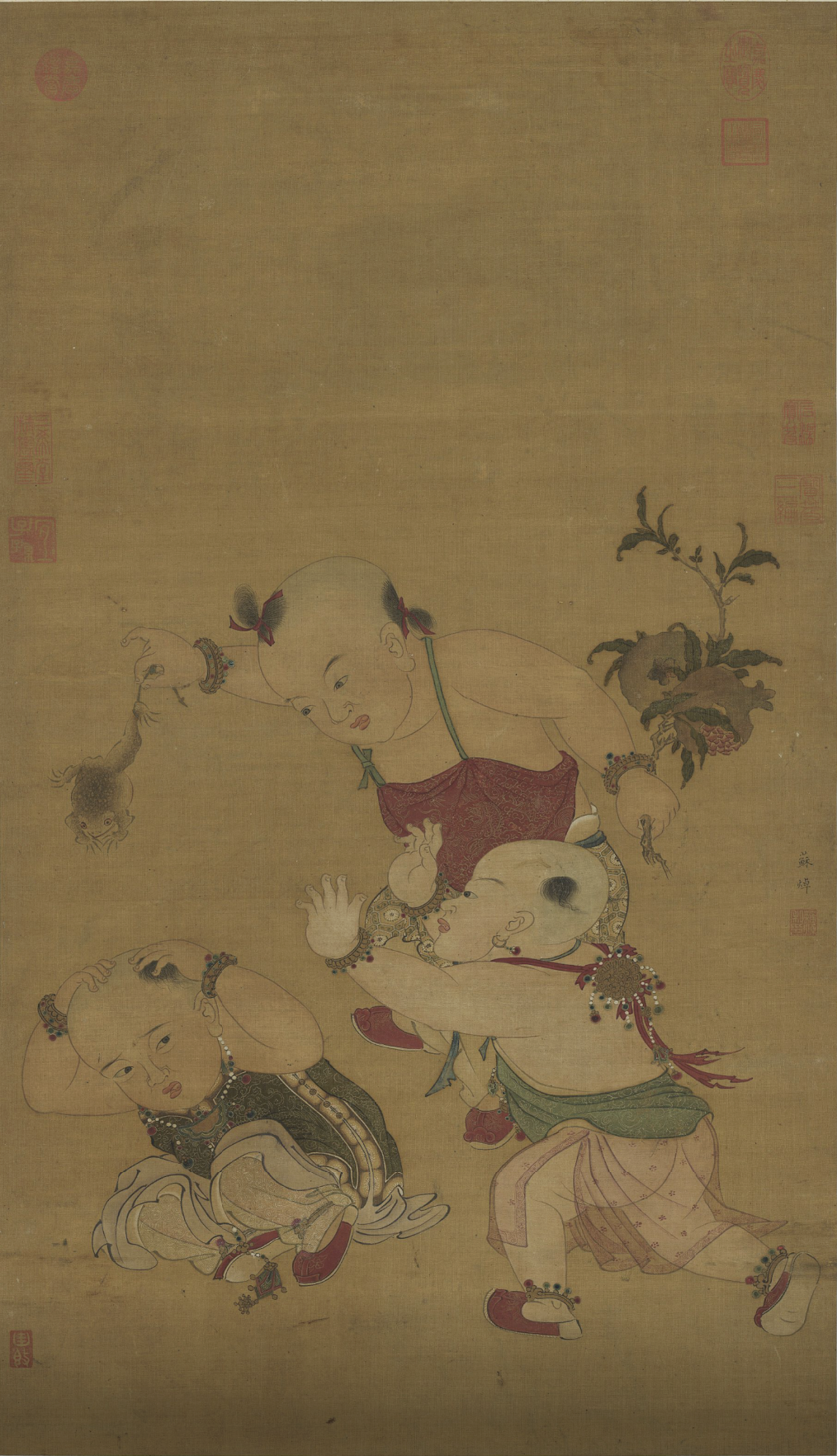 这幅台北故宫博物院所藏的《端阳戏婴图》中,画了三婴儿,一儿右手以绳系蟾蜍(五毒之一),左手执折枝双榴(五瑞之一,下文会作相关介绍),与另一个儿童嬉闹。容貌圆浑可爱,笔致工稳,设色淳雅。