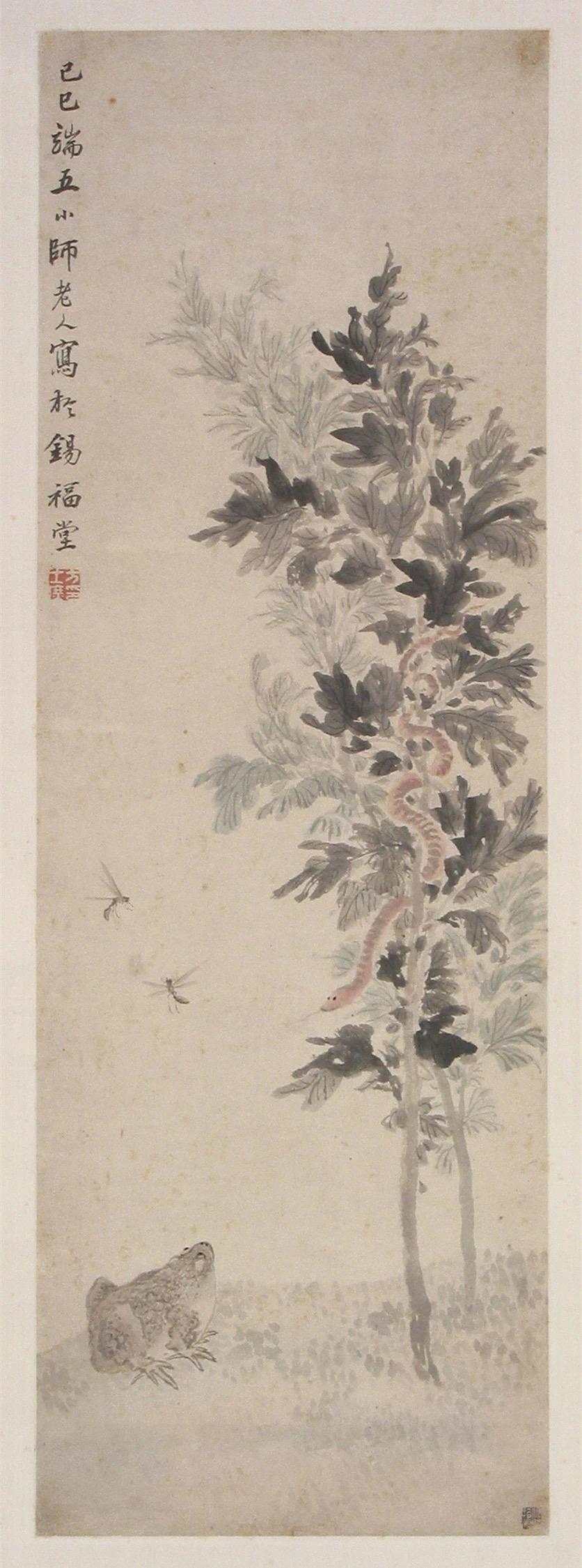 清代方士庶的《端午即景图轴》玩了一把“黑转粉”,创新性地将艾草与红蛇、蟾蜍、毒蜂并置,通过工细笔法展现“祛病除毒”主题,画面中蟾蜍昂首瞪眼的形象尤为突出。这种动物题材的加入,反映了清中期“午瑞图”对民俗信仰的吸纳——蟾蜍虽为五毒之一,但有药用价值(治疗疳病、狂犬伤毒),使其转化为祥瑞符号。