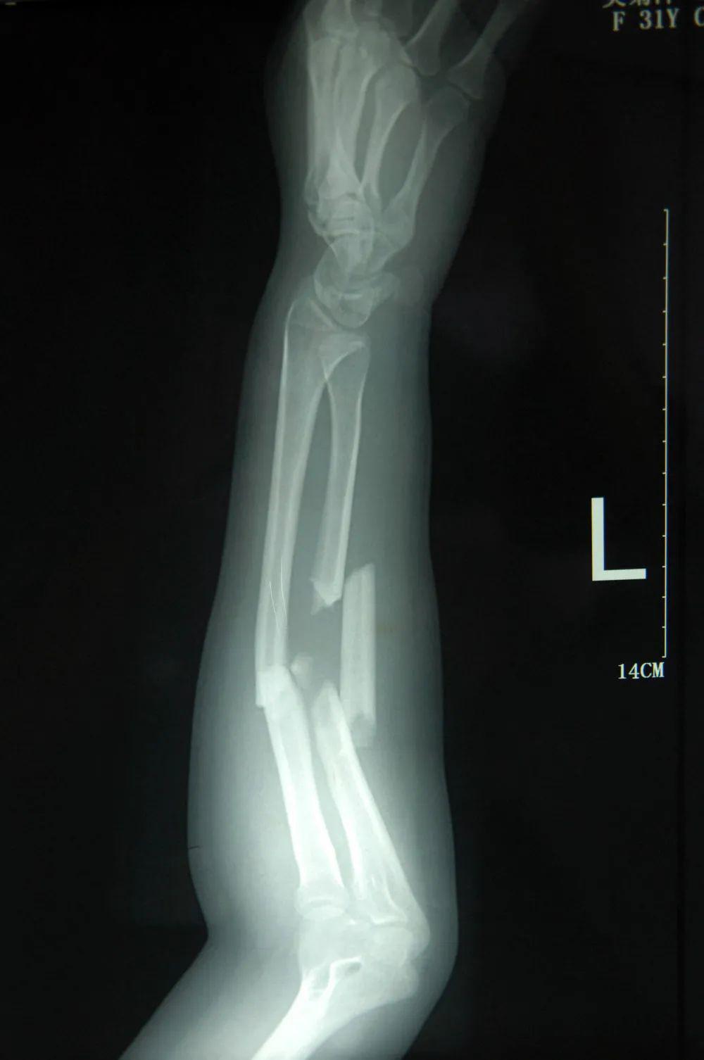 这是 2011 年 7 月 3 日拍摄的吴菊萍受伤左臂的 X 光片,医生诊断为手臂左尺桡骨多段粉碎性骨折。