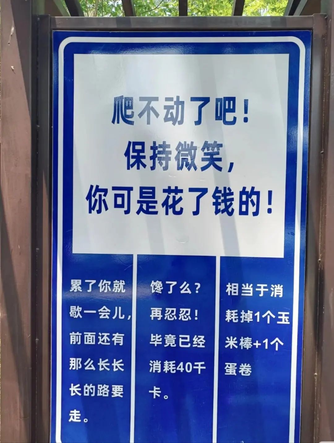 网友在帖子中贴出景区的指示牌标语,其中有“爬不动了吧,哈哈哈哈哈”“爬不动了吧,保持微笑,你可是花了钱的”“加油,别担心,还有三万步,你现在在想什么,是不是特别想回家找妈妈”等。
