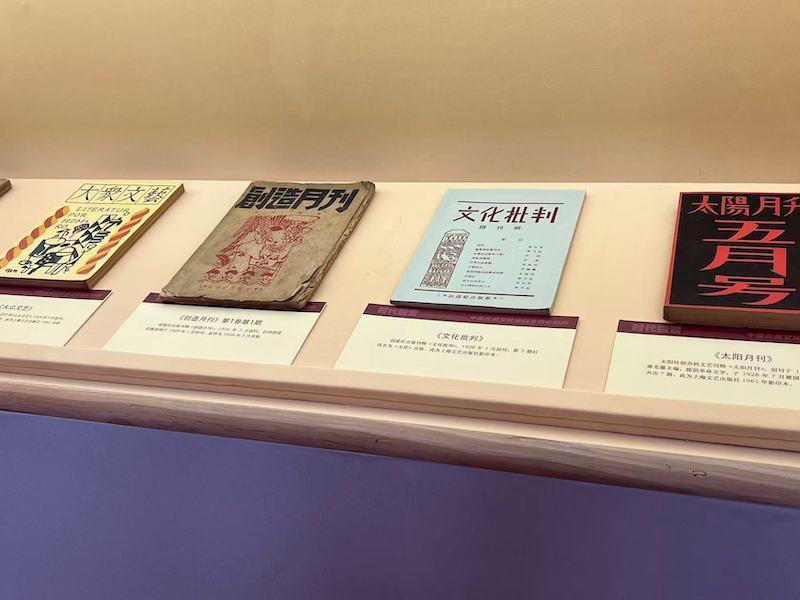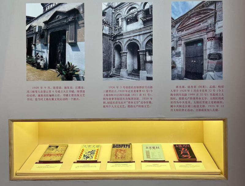 展览现场,展墙上印有景云里,三德里和丰乐里的照片,下方展柜呈现的是创造社、太阳社的刊物。