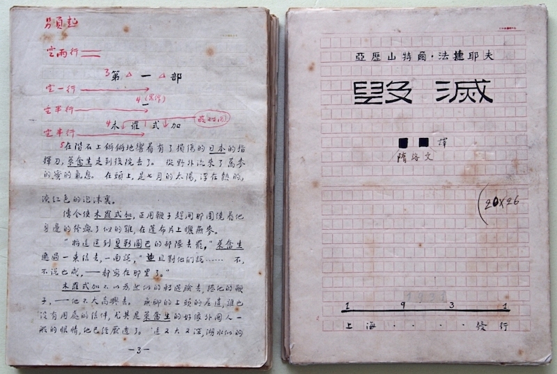 展柜中,《毁灭》是苏联作家法捷耶夫1925年至1926年间创作的描写红军游击队事迹的长篇小说。1929年下半年,鲁迅根据日本左翼作家藏原惟人的日译本进行转译,题作《溃灭》,署名“隋洛文译”。1930年1月,这部译作开始在《萌芽月刊》上登载,至第二部第四章时,月刊遭国民党当局查禁。1931年9月,鲁迅将译本更名为《毁灭》,由大江书铺出版发行。