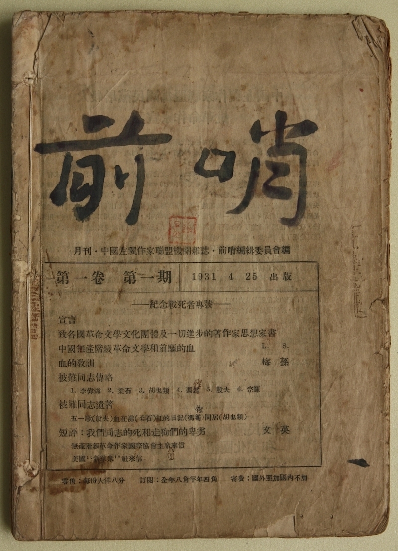 在期刊的展示中,《前哨》具有重要的意义。它是中国左翼作家联盟机关杂志,自第二期起改名为《文学导报》。1931年2月7日深夜,包括柔石、殷夫、李伟森、胡也频、冯铿左联五烈士在内的24名青年革命者,戴着叮当作响的镣铐,高唱着《国际歌》,走向就义的刑场。作为左联盟主和旗手的鲁迅感到极度悲痛,吟诵出《无题》(“惯于长夜过春时”)这首“郁怒哀切”的诗,表达了他“怒向刀丛觅小诗”的战斗意志。