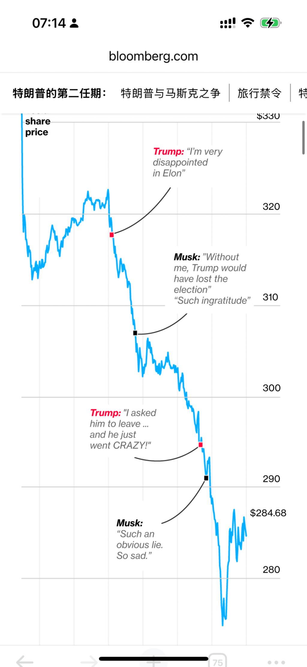 而随着两人撕逼,特斯拉的股价狂跌 14%,彭博为此专门做了一张图: