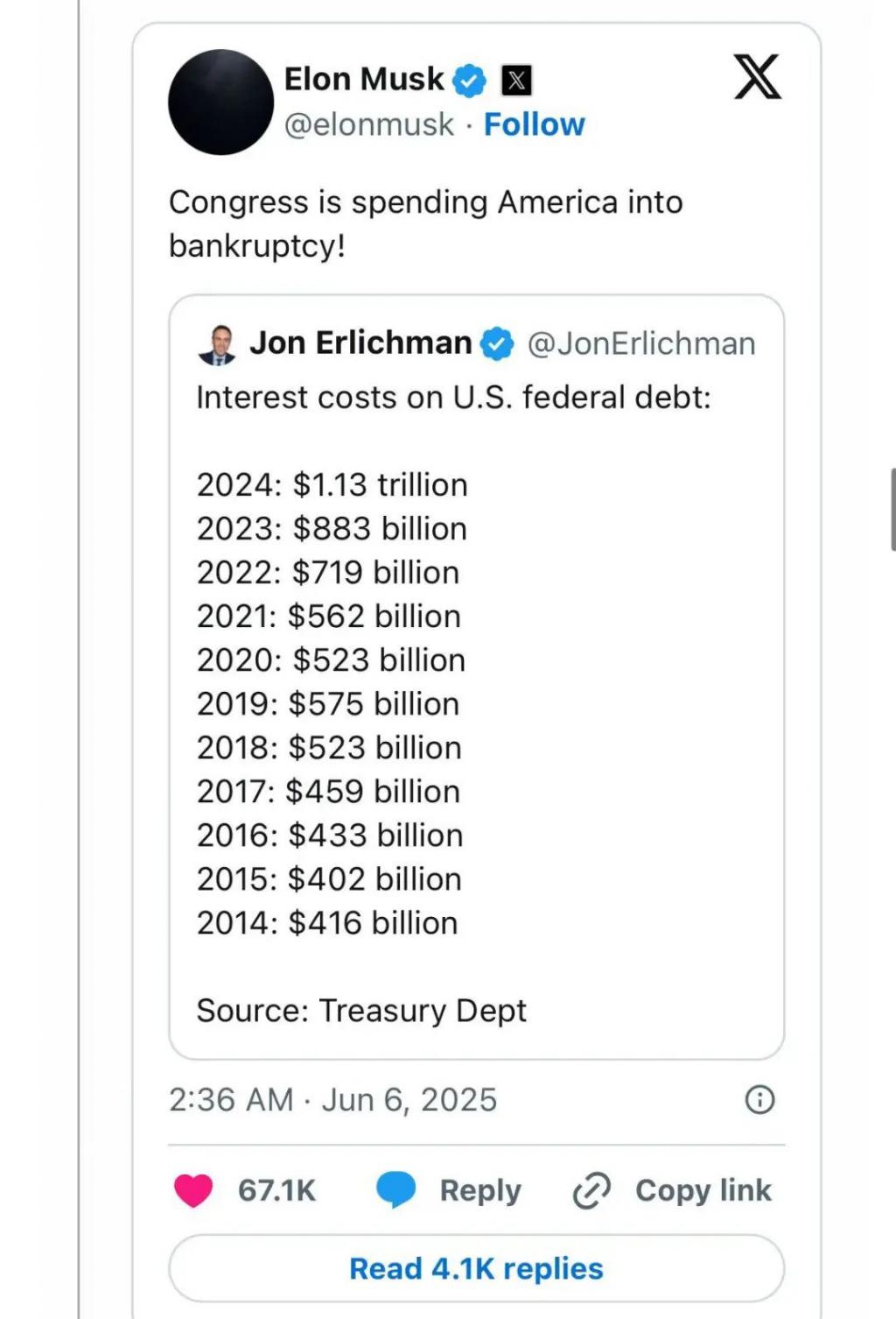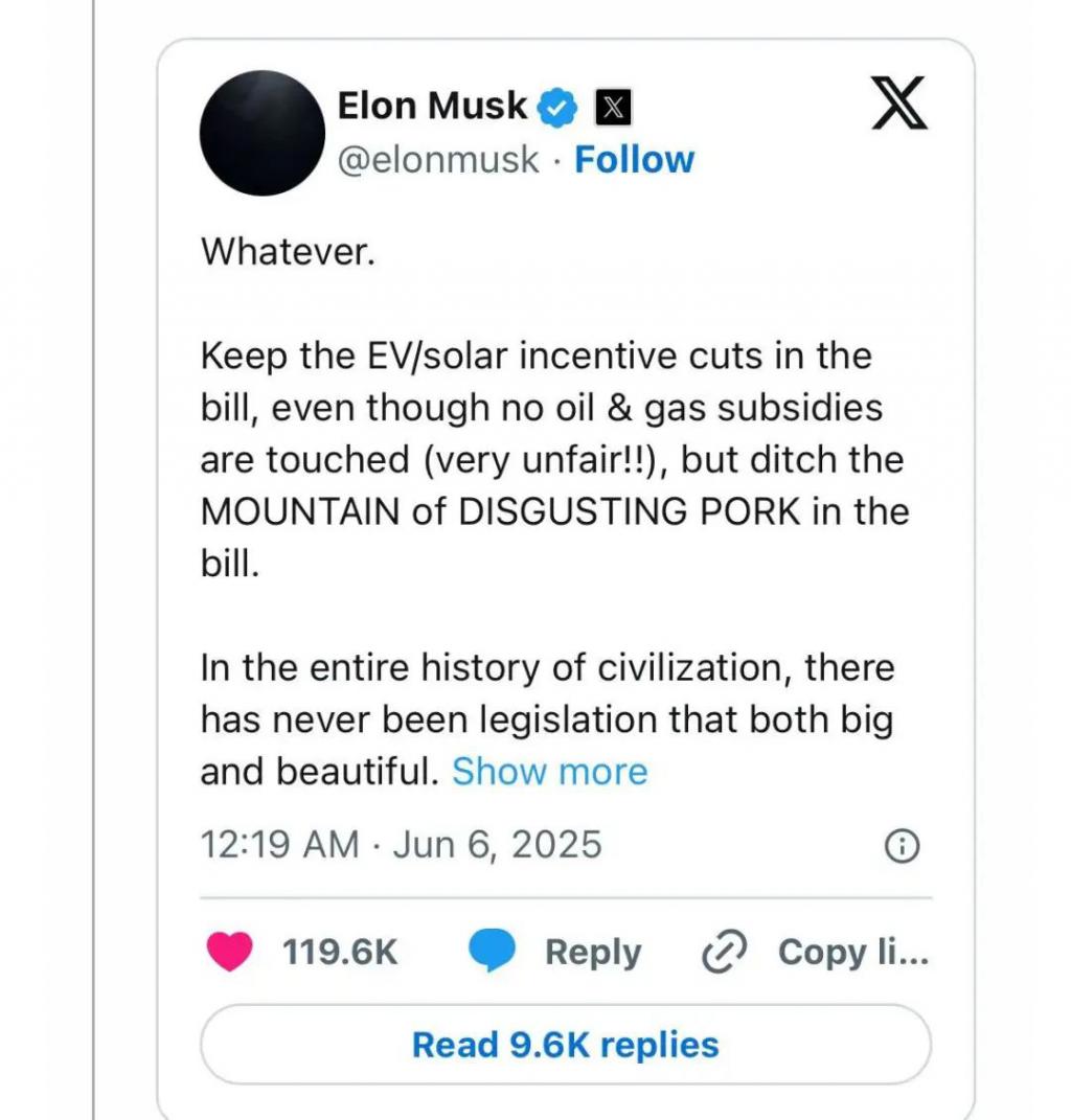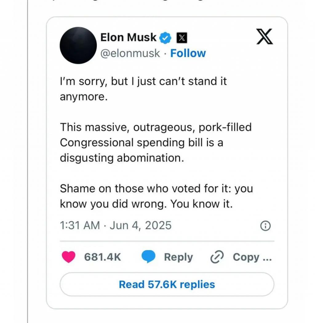 所以马斯克直言不讳,批评该法案 " 让美国破产是不对的!"