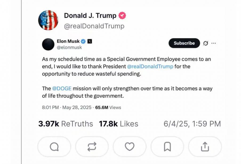 特朗普没说话,只是 po 了一张图,表示马斯克已经离开政府了