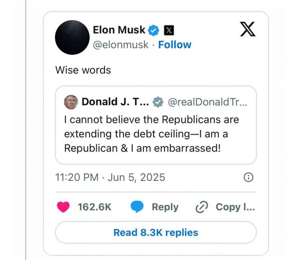 先是挖了特朗普之前发的 " 我简直不敢相信,共和党居然又提高了账务上限!作为共和党人我感到耻辱!"