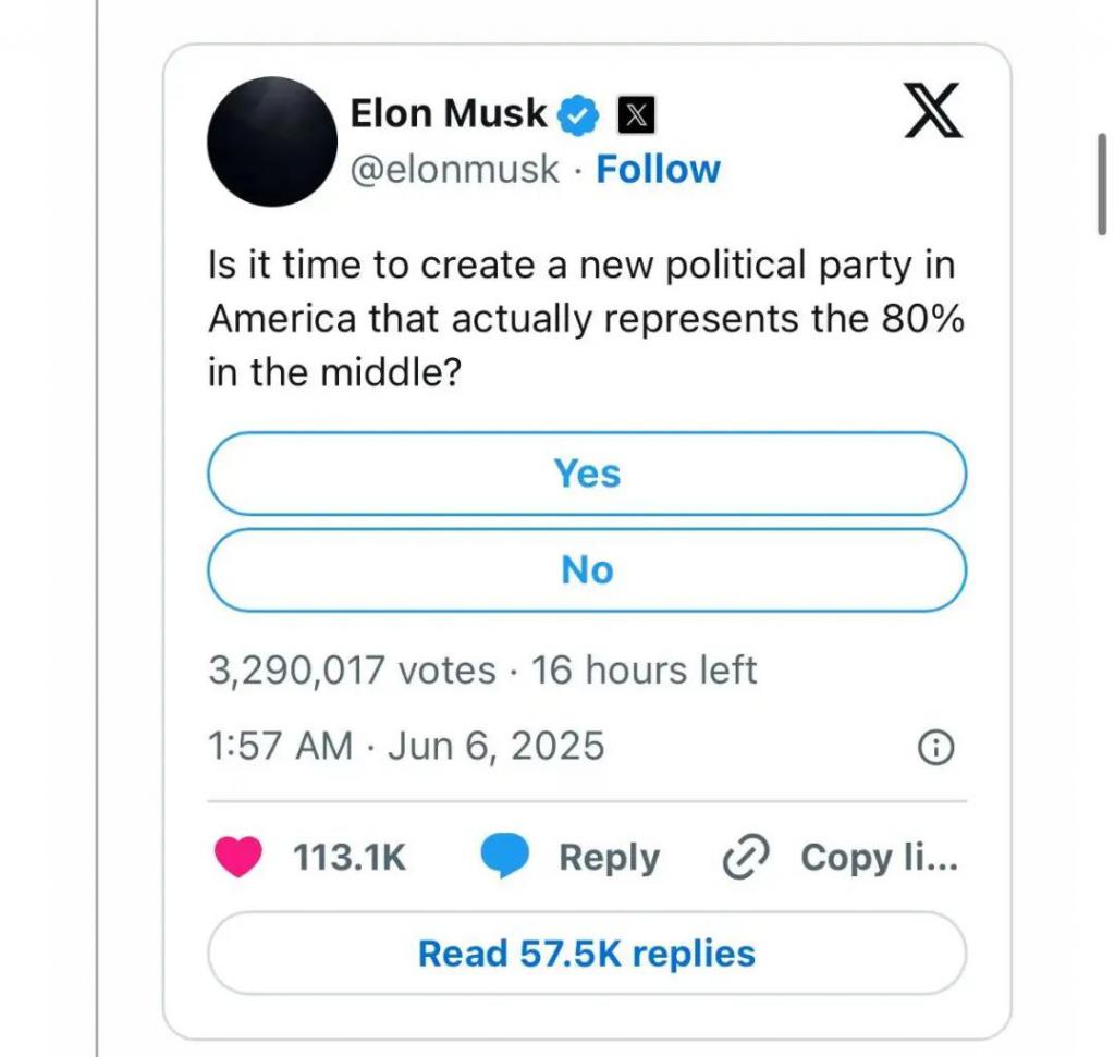 然后马斯克直接发起个投票,询问美国人是不是需要一个新党派:(大部分人选了 yes)