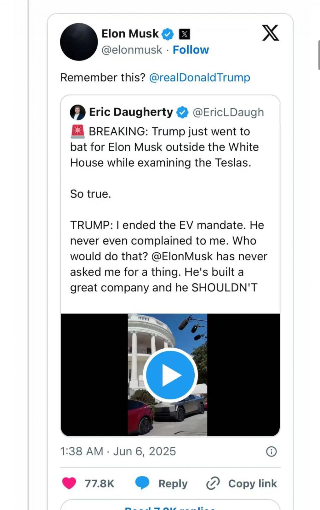 马斯克转发了特朗普在白宫前直播带货特斯拉的视频,@特朗普并表示 " 还记得那时候吗?"
