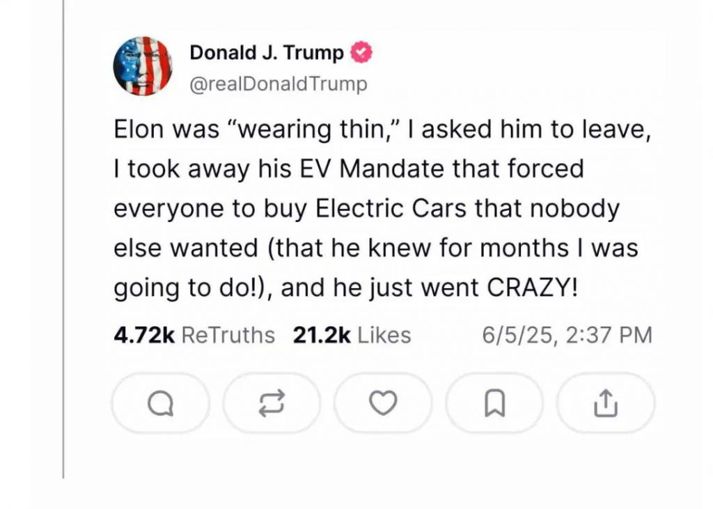 还表示根本没人要买他的电动车,只是因为 EV MANDATE ( 电动车强制销售政策 ) 不得不买。现在特朗普要把这个政策取消,马斯克就疯了。