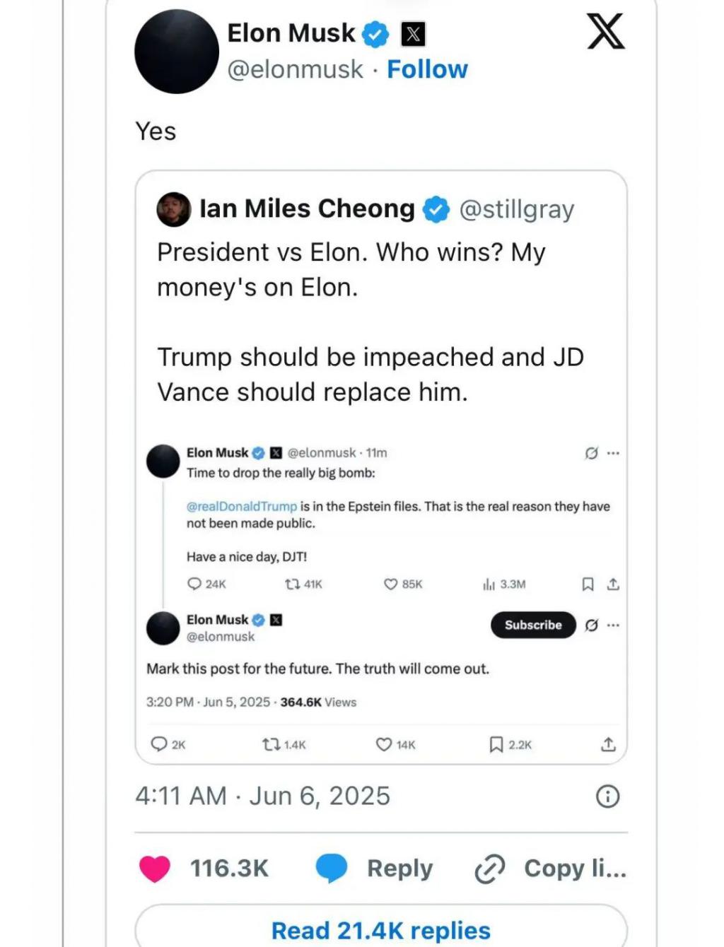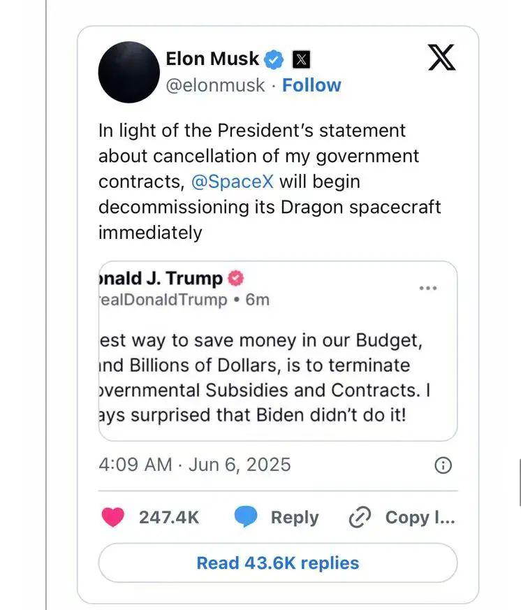 其实在马斯克逐渐淡出特朗普政府后,我就猜到他们俩会有这样一场大撕逼,只是没想到来得如此快,如此猛烈。